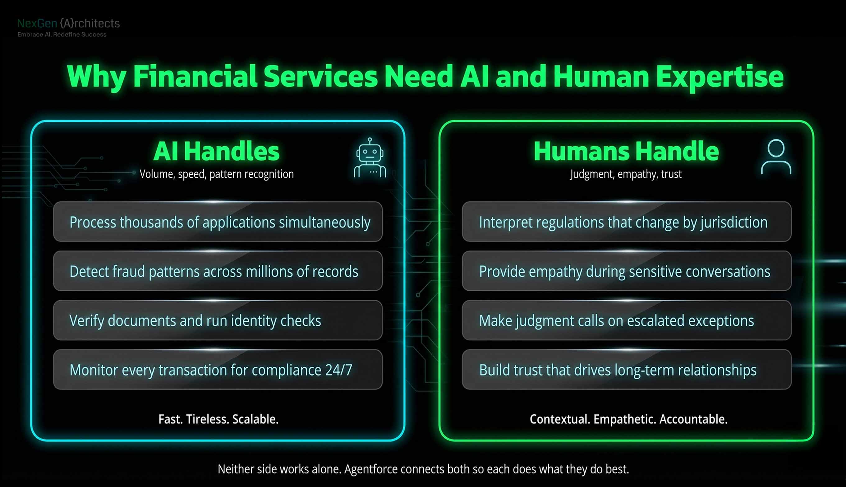 - AI handles data processing, pattern recognition, and repetitive tasks at scale. Humans handle empathy, judgment, and the decisions that regulations require a person to make.