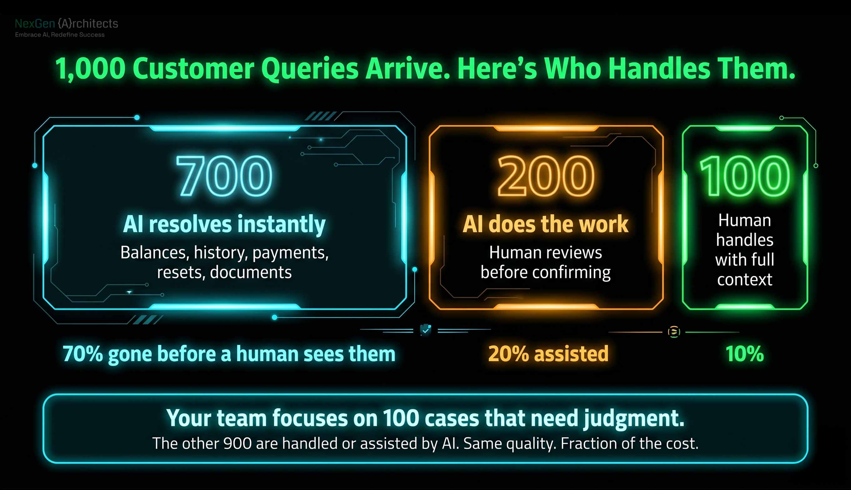 The escalation logic routes each case to the right tier based on complexity, urgency, and regulatory requirements. Simple queries stop consuming human time. Complex cases get faster resolution because the agent starts with full context.