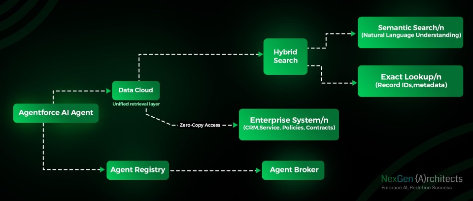 Agentforce follows a zero-copy principle. Data is never duplicated into external stores. Retrieval happens in place, under governance, and in real time. This reduces risk, eliminates data drift, and ensures compliance standards are met without additional overhead.