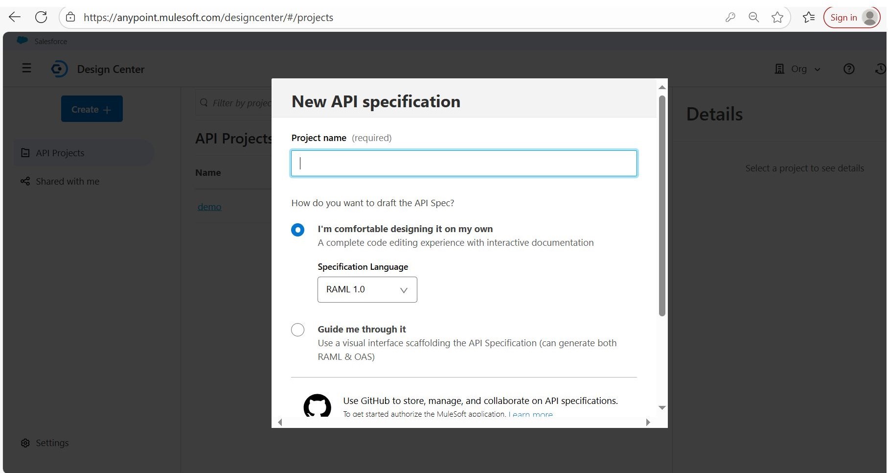 - Choose your specification language: RAML 1.0, OAS (OpenAPI 3.0), or AsyncAPI depending on your use case.