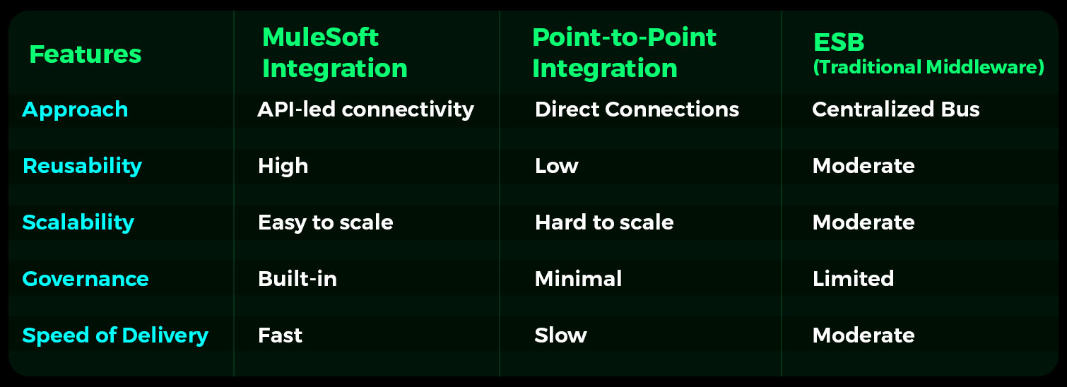 MuleSoft promotes an API-led connectivity model, where integrations are broken into System APIs, Process APIs, and Experience APIs. This modular approach avoids the spaghetti mess of point-to-point connections and ensures that each API can be reused across multiple projects, saving time and reducing costs.